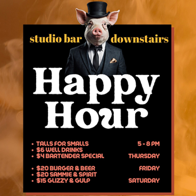 Studio Bar Hours: Thursday 5pm-11pm, Friday & Saturdays 5pm-12AM