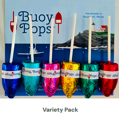 Our online store offers the full selection of Buoy Pops flavors and package sizes. Delivery is available for free or for a low flat fee. You can also find Buoy Pops at select shops across New England and beyond. Ask about custom Buoy Pops colors for weddings, events, and organizations. We participate in a number of fairs and festivals throughout the year, and we’d love to see you at the Buoy Pops booth! Please stop by and say hi.